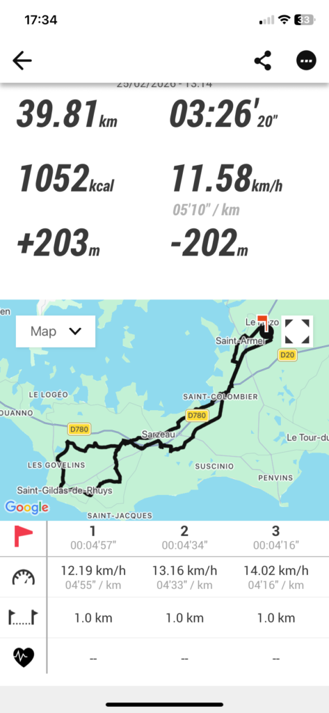 Actualités ALC, Atelier Randonnées VTC ATELIER RANDONNEE V.T.C. Françoise Chevalier27/02/202627/02/2026 Mercredi 25 février 2026 Nous nous sommes retrouvées à la mairie de Saint-Armel pour un départ à 3 direction Saint Gildas de Rhuys.Nous avons emprunté les routes partagées et les pistes cyclabes donc pas de souci de boue.Plus de secret pour nous le tunnel de Sarzeau, ça tourne beaucoup.A bientôt…Françoise Christiane, Nelly et Françoise Boucle de 40km